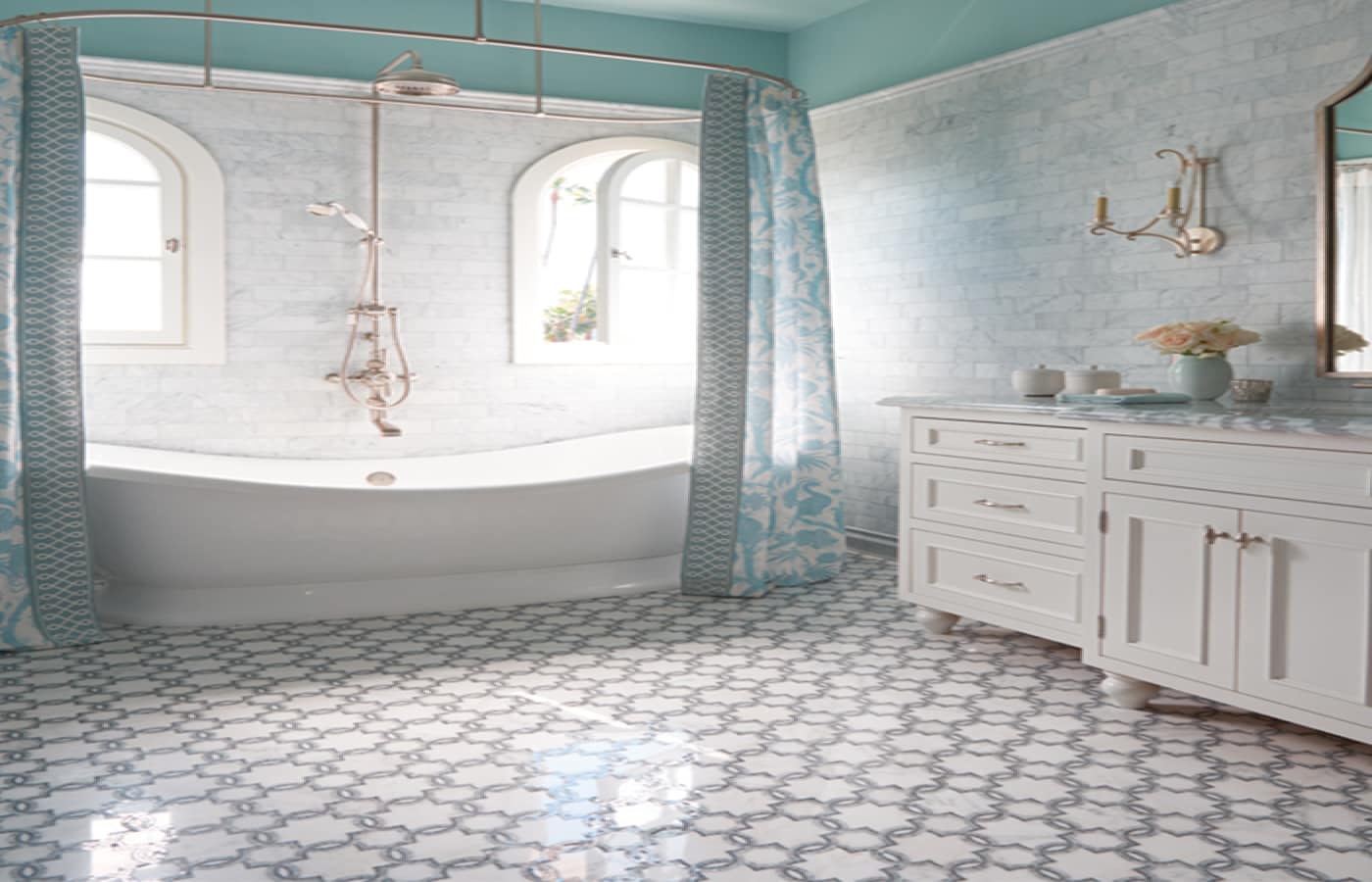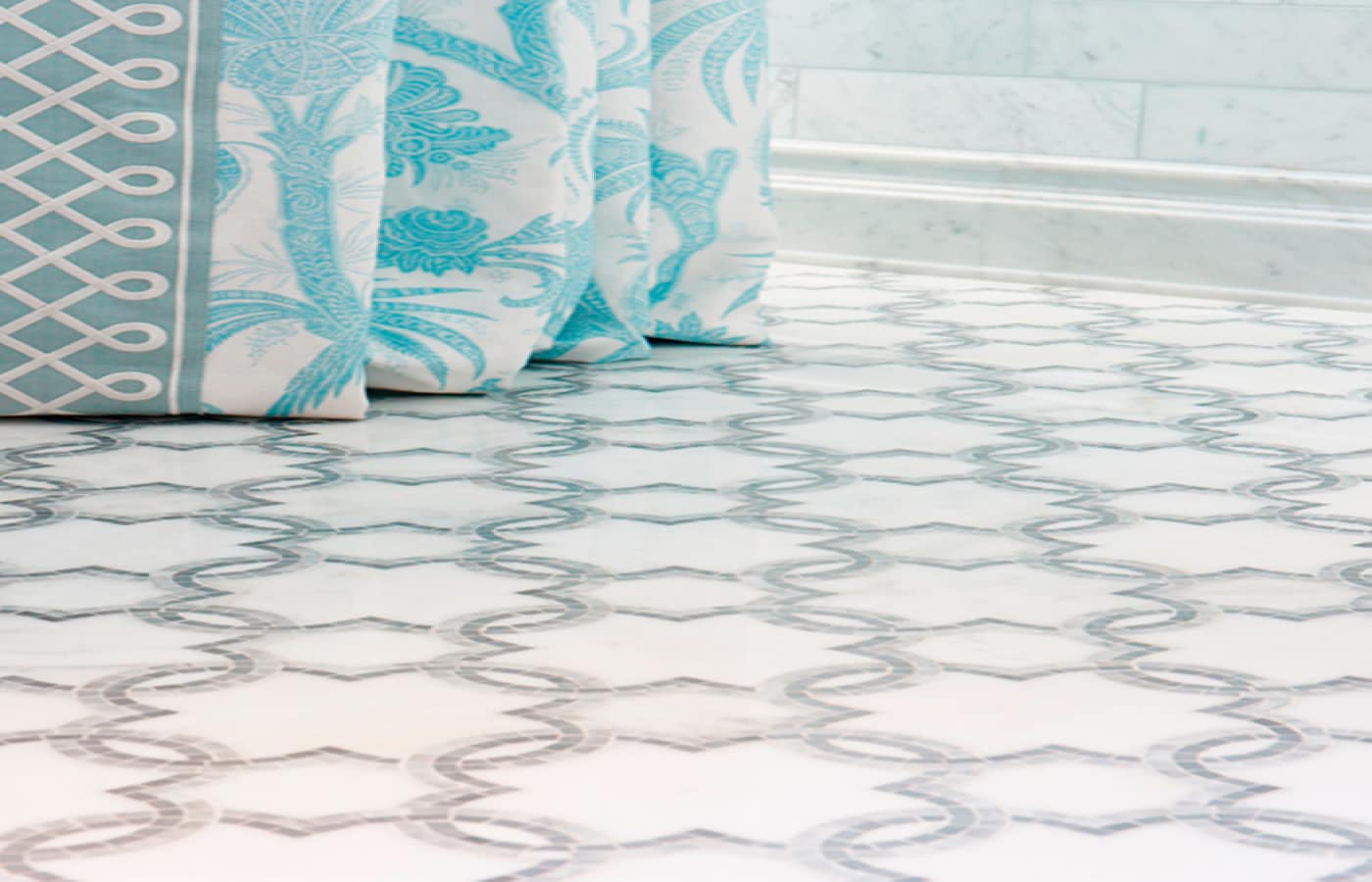 Materials: San Marcos in Grigio; Walls: Jet Set Carrara Field Tile 3″ x 9″