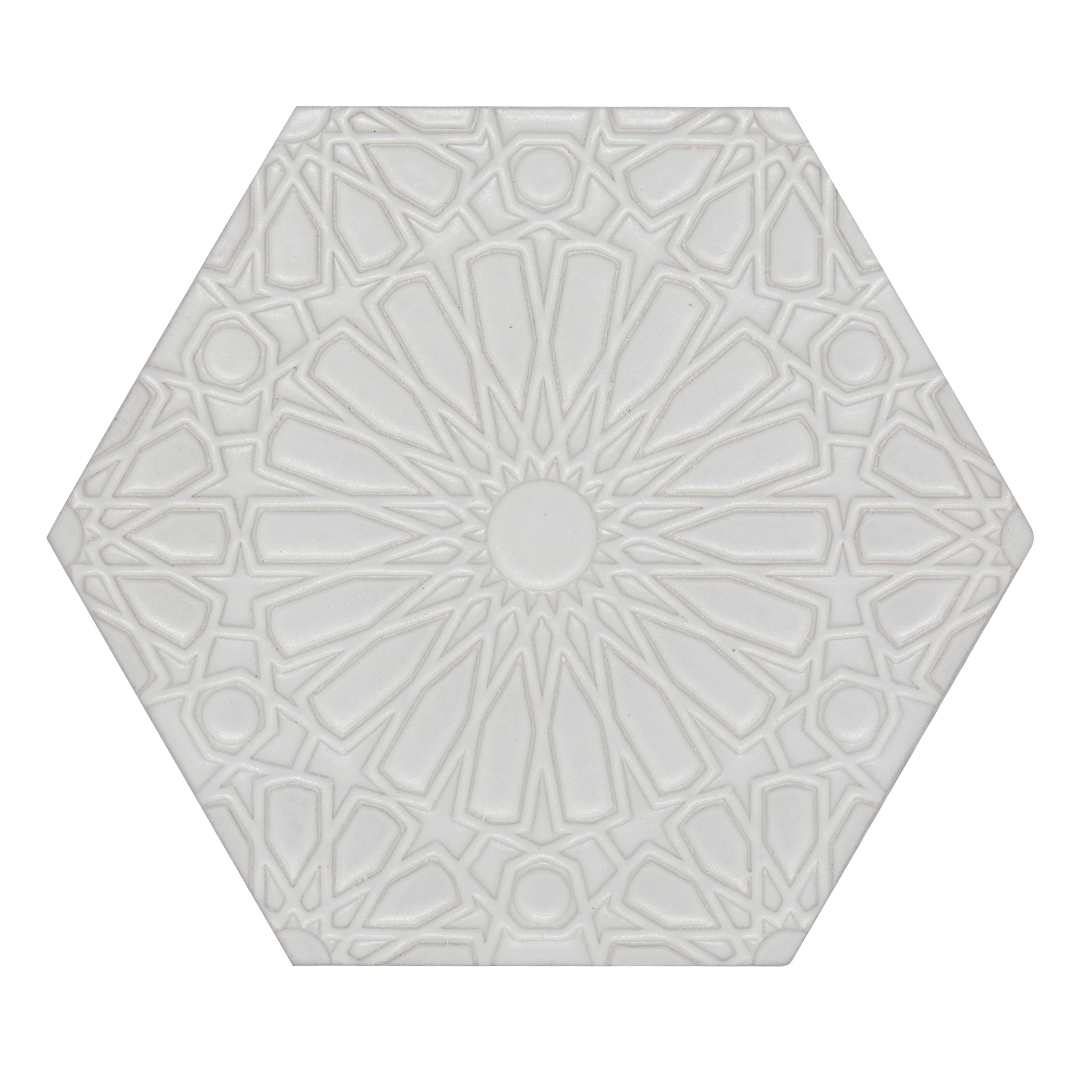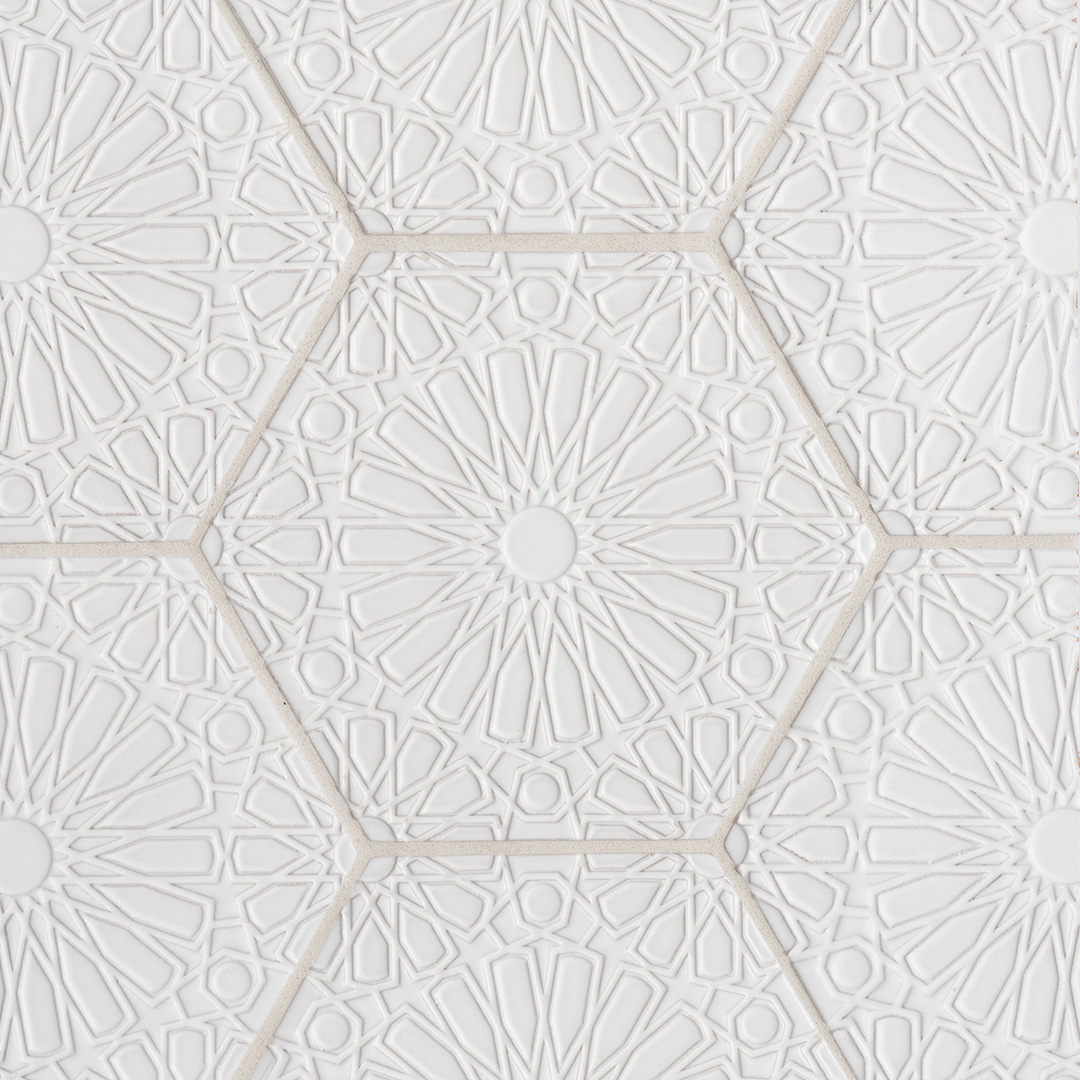 The handmade tile Andalucia Collection features dimensional glazed terra cotta with a sophisticated antique patina in shades of deep blue and white. Showcasing artisan beauty, the collection is inspired by details found in traditional Moorish architecture. Designed with layered shapes through repetition, each pattern creates a timeless, traditional look in a fresh modern shape.