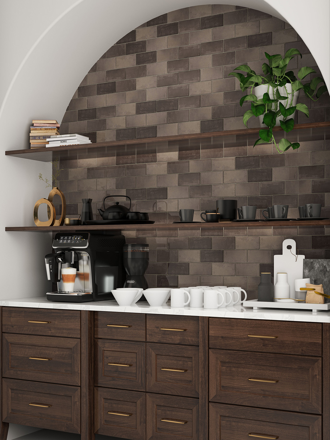 Handcrafted and Zellige in appearance, the Café collection from Walker Zanger brings neutral ambiance to your space. Artisanal in character and subtle in color variants, thse ceramic field tiles with bullnose trims complete a design with warmth, comfort and sophistication. Use them in a vertical stack tile pattern for a different look.